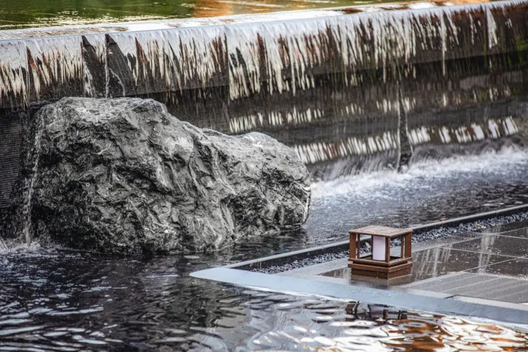 又比如,项目延续了张园“引水入园”的理念,将长200m近1000m2的水系覆盖到整个社区内。水景形态各异,有中心静水、三层跌水、点状涌泉、立面叠瀑、弧形流水五大不同呈现方式。水系的引入,让整个社区彻底灵动飘逸了起来。