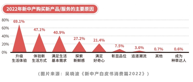 另一方面,新中产也是更注重“体验式”消费的一群人,也更热衷于尝试新鲜事物。新中产群体将更多的时间用于陪伴家人、锻炼身体和文化体验中,追求的是文化享受和成长体验。数据显示,近7成的新中产在购买新产品/服务时的主要原因是升级生活体验,其次是体验新生活方式,随后才是满足生活基本需求。