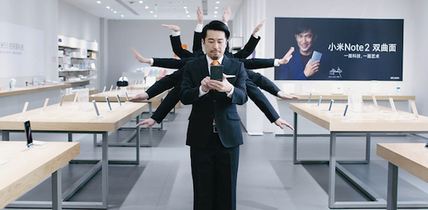 这支宣传片里出现了小米从手机到电饭煲的一系列共12个产品。除了背景中醒目的小米Note2代言人梁朝伟和右下角的更新的产品名,人们第一眼并不会把舞蹈和小米的产品联系到一起。西装大叔们兀自在店里玩的开心,并没刻意宣传小米的产品性能,而是自然地把它们变成了舞蹈道具。