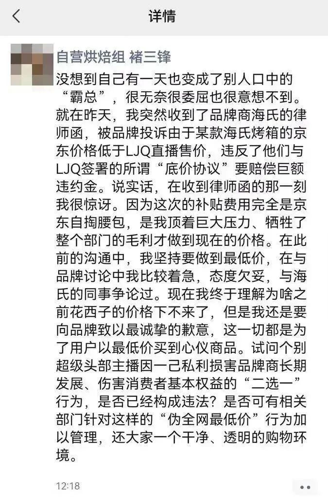 10月24日,一名负责海氏烤箱的京东采销在朋友圈直接开炮,原因是,他收到海氏公司的律师函,因一款烤箱的京东售价低于李佳琦直播售价,违反了海氏与李佳琦签署的「底价协议」,要求赔偿违约金。当天下午,「京东采销喊话李佳琦」登上微博热搜。