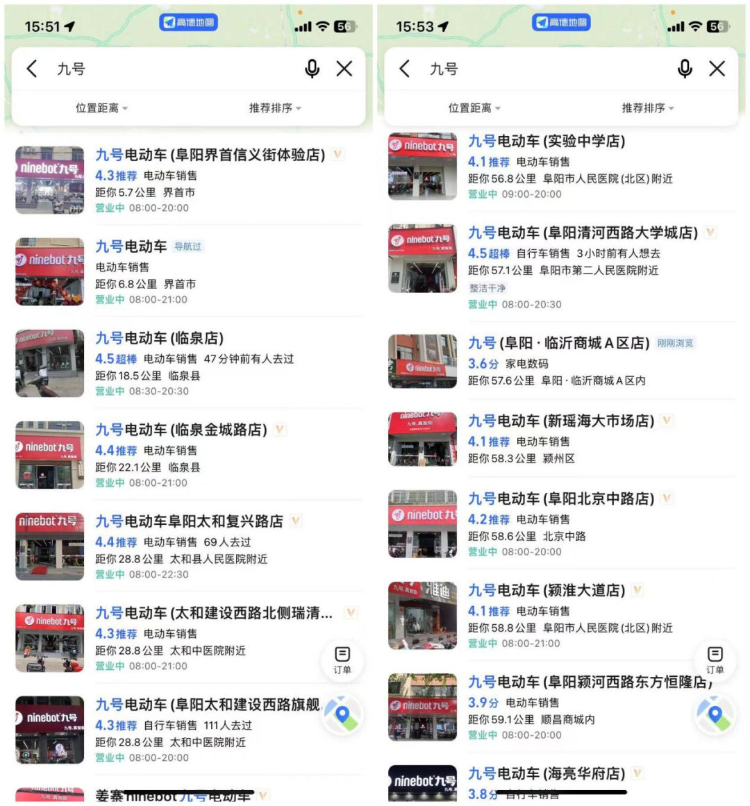 同样在临泉,高德地图中搜索九号电动体验店出现2家,界首市、太和县也有两家,阜阳市门店更多。换言之,目前九号县城布局明显高于小牛。