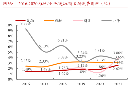 加上近几年雅迪、爱玛为弥补自身智能化的短板,均加大研发费用投入。以2021年为例,爱玛、雅迪、新日、小牛的研发费用率几乎来到同一区间,这也使其和小牛、九号在智能化的差异上逐渐缩小。