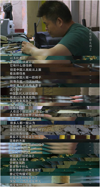 文物其实跟人是一样的,你看,我们从过去最早的时候说,玉有六德,以玉比君子,玉就是一块破石头,它有什么德性啊,但是中国人就能从上面看出德性来。所以中国人做一把椅子,就像在做一个人一样,他是用人的品格来要求这个椅子。中国古代人讲究格物,就是以自身来观物,又以物来观自己。所以我跟你说,古代故宫的这些东西是有生命的。人在制物的过程中,总是要把自己想办法融到里头去。人在这个世上来了,走了一趟,虽然都想在世界上留点啥,觉得这样自己才有价值,很多人都一般认为文物修复工作者是因为把这个文物修好了,所以他有价值,其实不见得是这么一个简单的方面。他在修这个文物的过程中,他跟它的交流,他对它的体悟,他上面已经把自己也融入到里头。文物是死的,要文物干什么,要文物的目的就是为了要让它传播文化,对吧,不是说文物就是为了保留一个物品放在那儿,那没有什么价值。