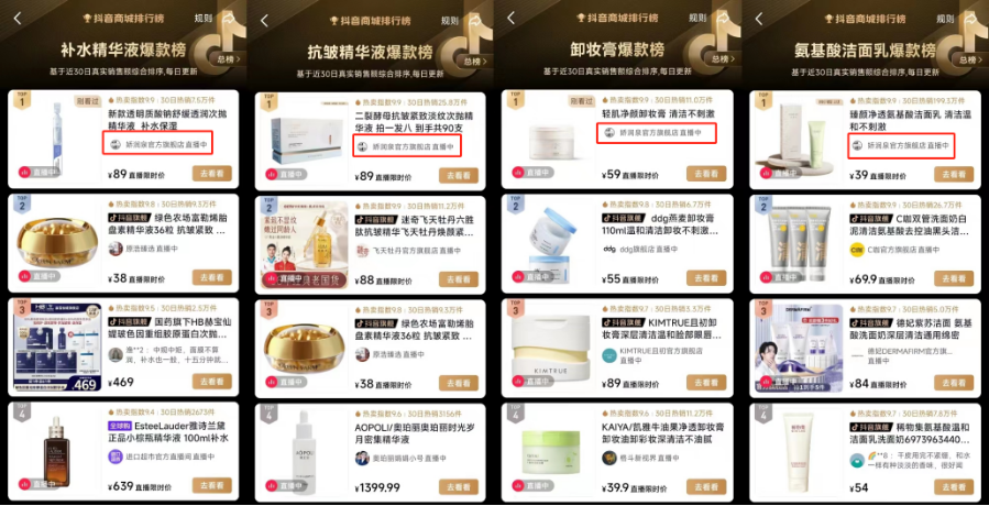 娇润泉就是三只羊靠着直播切片做起来的代表,作为一个仅有四款产品的白牌商家,在短短的一百多天里,所有产品均成功登上各细分类目的抖音排行榜第一,月销高达1.5亿。