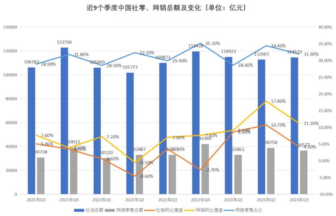 国家统计局数据显示,2023年1~9月,全国网上零售额10.8万亿元,增长11.6%,高于社会消费品零售总额增速4.8个百分点,实物网零对社零增长贡献率达33.9%。