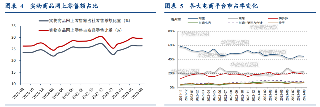 根据华创证券统计,线上渗透率稳定提升至33%,增速平稳仍高于线下。23年1-3Q五大电商平台汇总GMV,同比增速为11%,根据统计局与邮政局数据计算,1~8月实物网上零售额79821亿元,同比增长9.5%,1-8月累计全网包裹件单价98元/件,延续线上消费降级趋势。