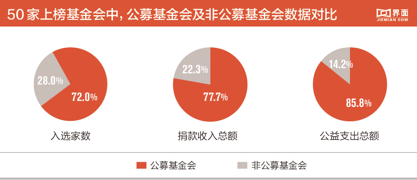 公募基金会是主力。50家入选基金会中有36家为公募基金会,14家为非公募基金会。36家公募基金会的2015年捐款收入总额和用于公益支出总额分别为70.0亿元、67.2亿元,占50家入选基金会捐款收入总额和公益支出总额的77.7%、85.8%。14家非公募基金会的2015年捐款收入总额和公益支出总额分别为20.1亿元、11.1亿元,占50家基金会捐款收入总额和公益支出总额的22.3%、14.2%。由此发现,公募基金会在募捐能力和公益支出方面明显优于非公募基金会。