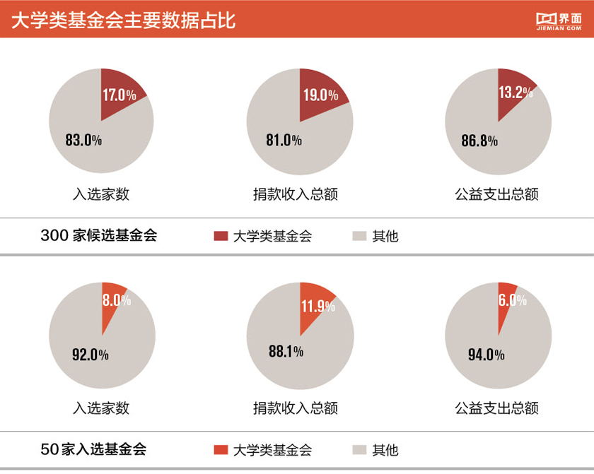 大学类基金会表现逊于整体水平。在榜单上排名最高的大学基金会是北京大学教育基金会和北京理工大学教育基金会(并列第26名),这和大学类基金会应有的实力不相称。我们将300家候选和50家入选中的大学类教育基金会(包括了大学基金会,1家职业技术类基金会、1家中学基金会)数据做比较可以发现:在300家候选中有51家基金会,这51家大学类教育基金会2015年的总捐款收入额和公益支出额分别为50.8亿元、33.8亿元,占前300排行榜的总捐款收入额和公益支出的19.0%、13.2%;而入榜50家中只有4家大学类基金会,捐款收入总额和公益支出总额分别为10.7亿元、4.7亿元,占前50家基金会捐款收入总额和公益支出总额的11.9%、6.0%。