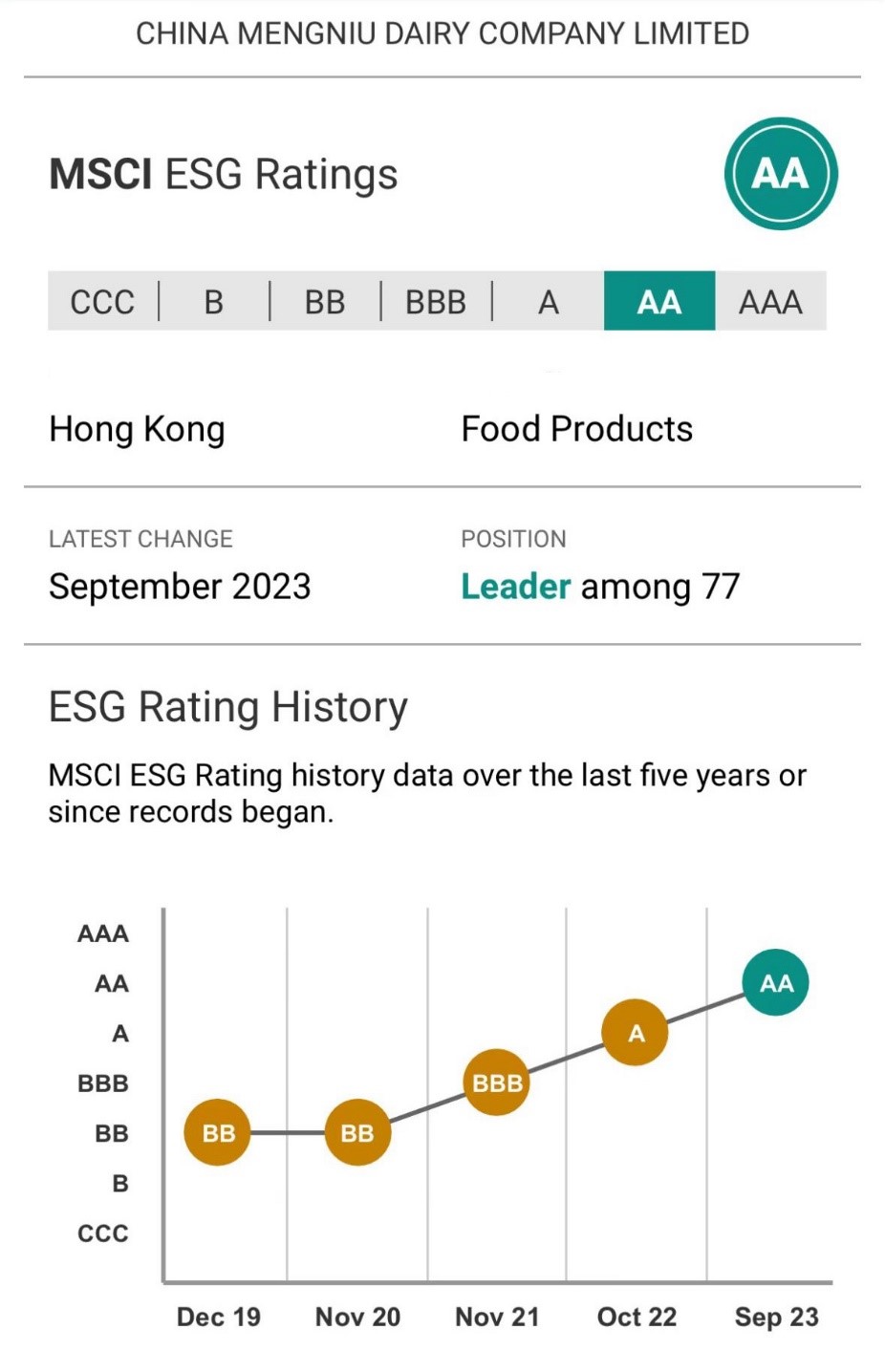 蒙牛与上下游伙伴的努力,也得到了国内外权威机构的认可。今年,蒙牛已连续3年蝉联“恒生可持续发展企业指数成分股”,位列国资委“央企ESG·先锋100指数”第三名,被标普全球评为“行业最佳进步企业”。就在不久前,蒙牛在MSCI ESG评级中获评AA,不但成为中国唯一一家取得“AA”评级的综合型乳制品企业,也在所有77家参评同业企业中位居“领导者”水平。