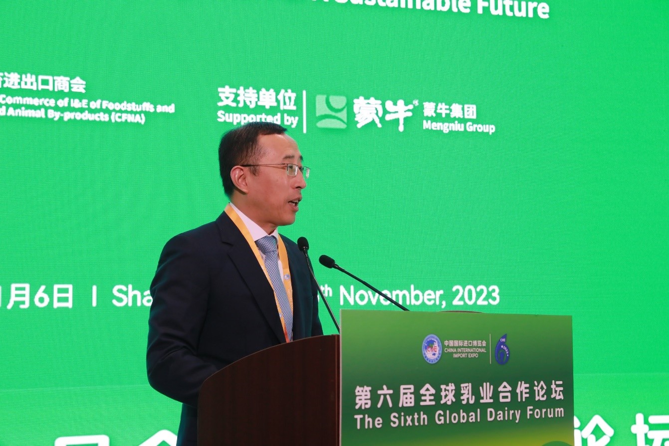 11月6日,作为第六届进博会的重要配套活动之一,第六届全球乳业合作论坛在沪召开。本届论坛以“携手可持续,共享新未来”为主题,由中国食品土畜进出口商会主办、蒙牛集团承办,国内外政商人士和行业专家齐聚一堂,共同探讨乳制品的可持续发展、乳业净零排放等热点话题。