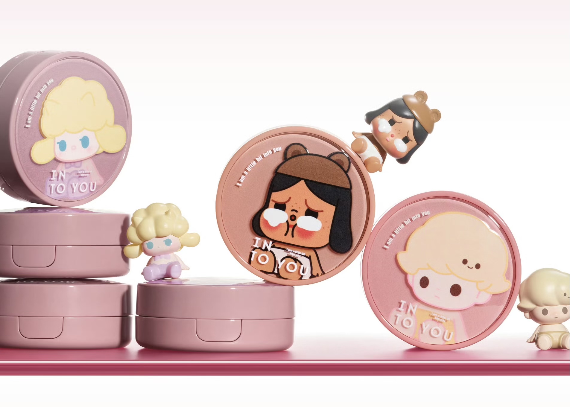 INTO YOU与泡泡玛特联名推出全新彩妆系列礼盒,包括空气唇泥、气垫腮红以及双头眼线笔。