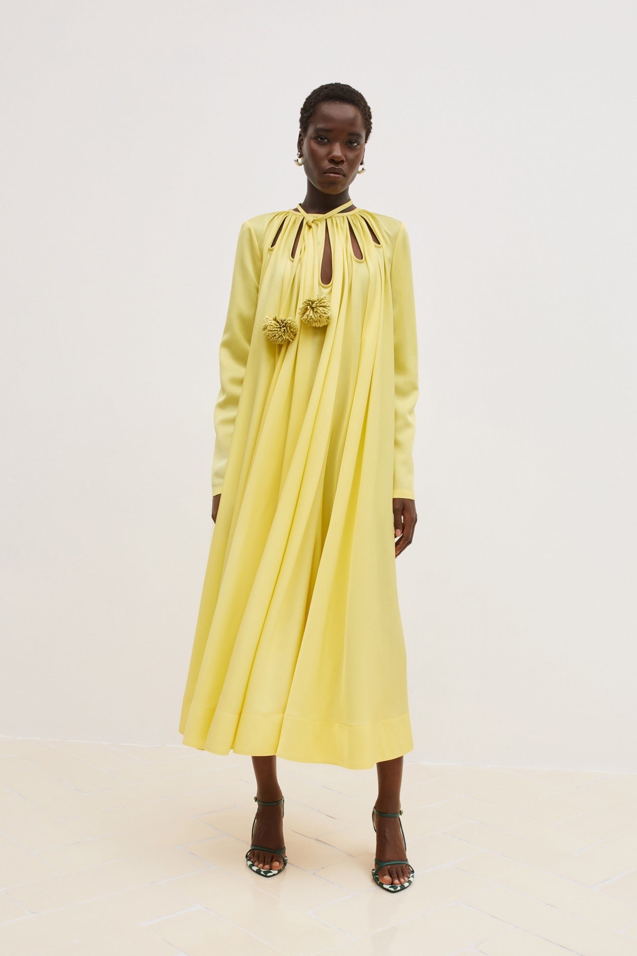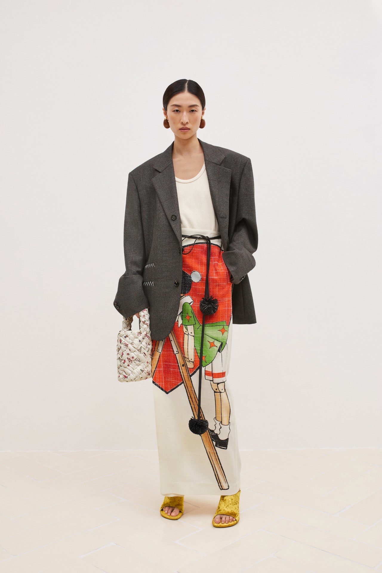 Matthieu Blazy继续本能地用普通的物品创造严肃的时尚。例如一件优雅的连衣裙上印有一个跳舞的提线木偶,莫名增添了一丝俏皮和奇思妙想。