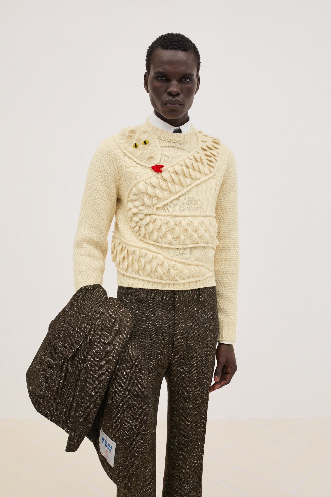 螃蟹印花连衣裙被重新塑造成一件绿松石和珊瑚色调的毛衣裙套装;另一件象牙色毛衣饰有一条缠绕的蛇和其鲜红色的分叉舌头;背面缝有超大标签的定制背心,或许会唤起人们对于青春时光的回忆。