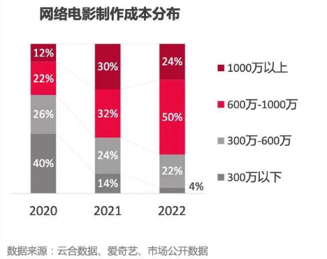 但这样的速度赶不上行业大潮,云合《2022网络电影年度报告》显示,七成影片制作成本达600万,而成本300万以下的网络电影从2020年的40%断崖式下降至2022年的4%。
