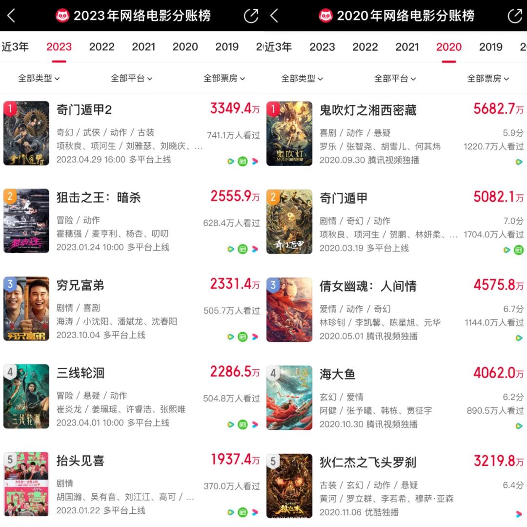 2020和2023年top5分账网大票房对比