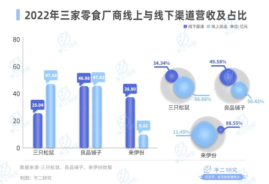 「不二研究」认为,从实际营收数据来看,三只松鼠倚重线上渠道;良品铺子采取“两条腿走路”策略,在线上和线下均有所布局;来伊份则主要依赖线下渠道。