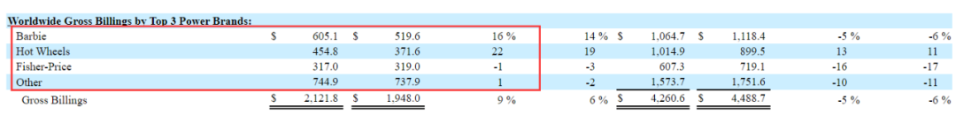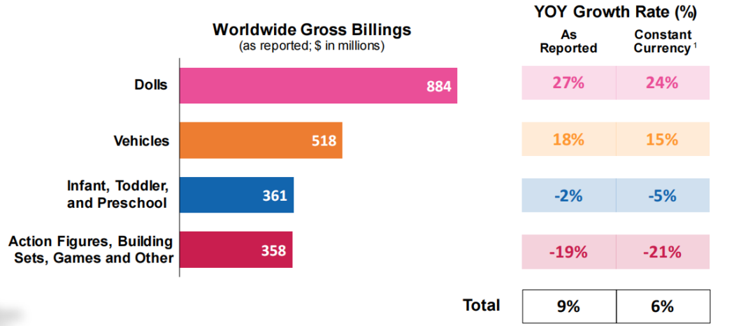 【汽车玩具类产品】总销售额为5.18亿美元,增长18%,主要是由于风火轮的增长。