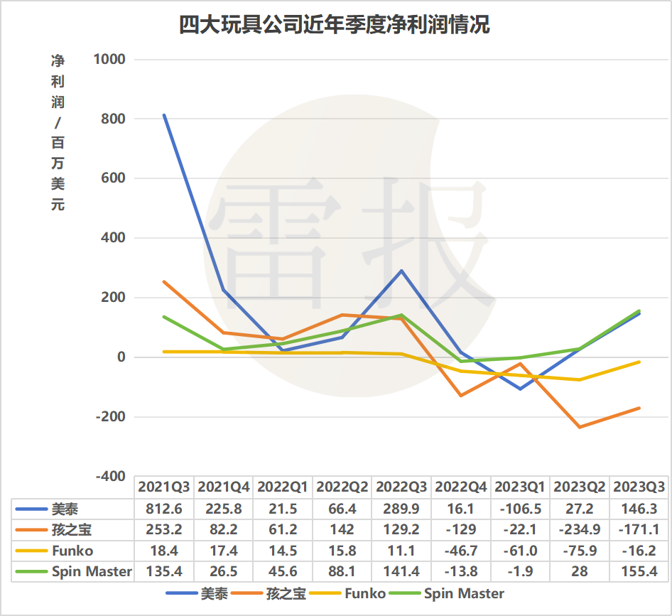 根据雷报此前的报道【孩之宝半年亏2.57亿美元,5亿美元出售小猪佩奇公司影视业务|雷报】,上半年孩之宝总的净亏损达到2.57亿美元,再加上Q3的亏损,孩之宝的前9个月已经巨亏4.27亿美元,相比去年同期4.26亿美元的净利润,盈利情况堪称“滑铁卢”。