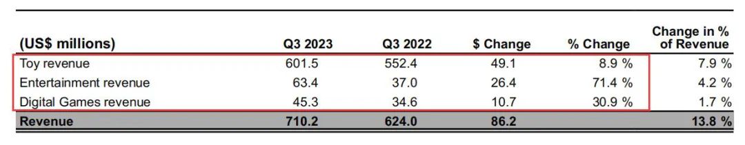 这也是孩之宝Q3业绩报告中少数称得上“可圈可点”的地方。第三季度,该部门收入同比增长40%,运营利润同比增长99%。