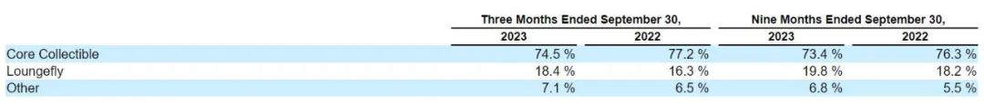从销售额占比看,潮流玩具的销售额占比有所下降,而loungefly潮流服饰、包含游戏和NFT等在内的其他部门的占比则有所上升。但由于整体销售额从2022年Q3的3.66亿美元减少至今年Q3的3.13亿美元,计算可得,实际上每个业务板块的收入都在下降。