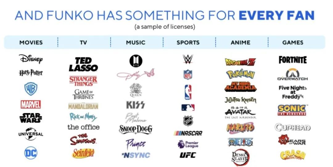 作为一家以生产潮流玩具为主要业务的公司,手握众多IP的玩具生产授权是Funko的核心竞争力。