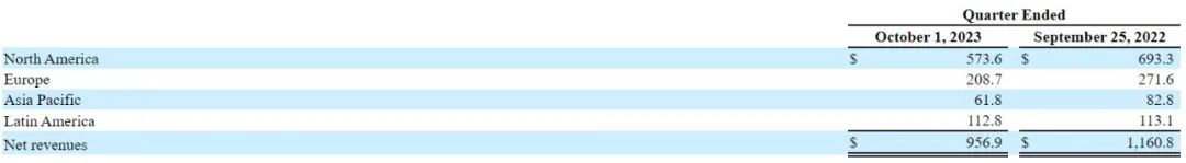 从地区划分,孩之宝消费品的细分市场上,北美、欧洲市场收入继续下行,同时,上半年还在增长的亚太和拉丁美洲地区也开始同比减少,下半年形势貌似更为严峻。