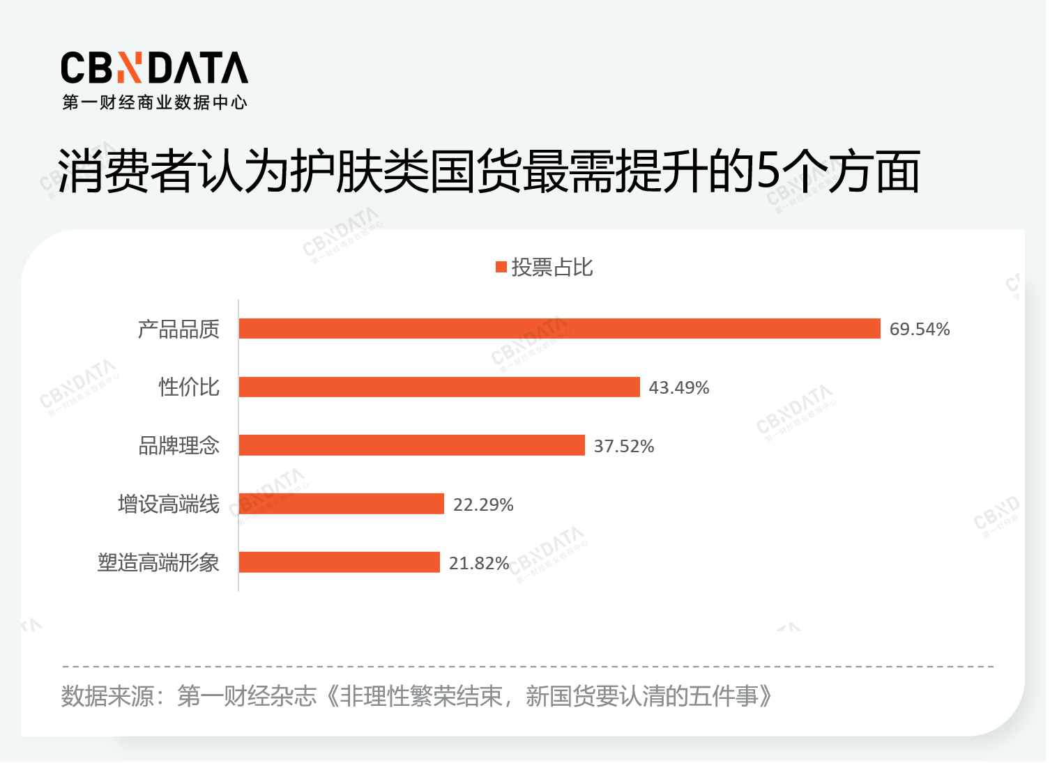 这一方面来自消费端对国货美妆的认可与期待。《第一财经》杂志发起的“新国货榜样”大调查数据显示,消费者对于护肤国货的改进方向建议中,品牌理念、增设高端线、塑造高端形象位居前五位。
