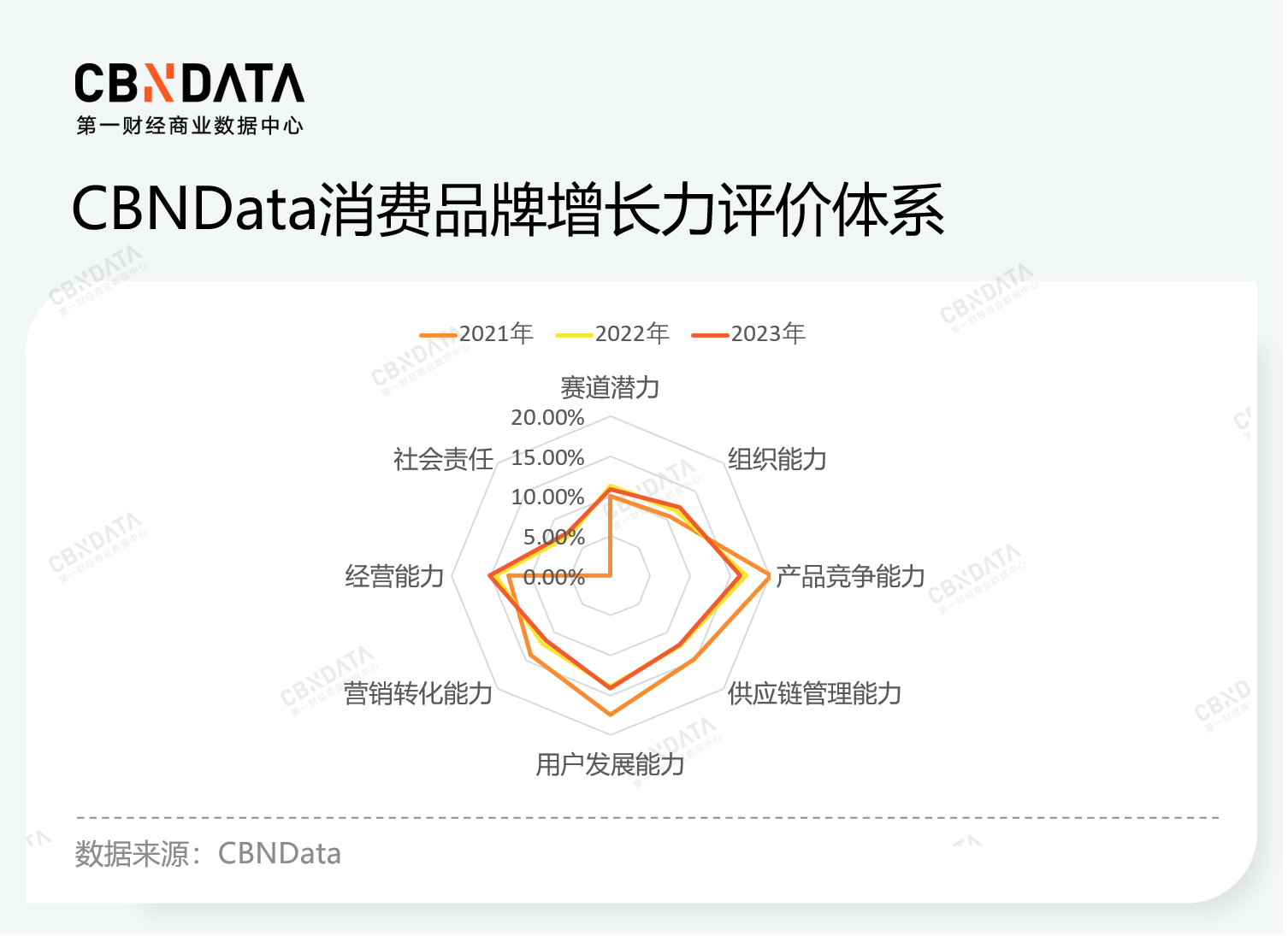如同人文财经观察家秦朔所言,“在那样一个高歌猛进的时代过去后,在带有一定浮华泡沫的表象背后,我们看到了一种更加真实、更加具有持久韧性的消费力在慢慢地穿越这些迷雾,打破泡沫,健康地往前去生长。”对于这种具有韧性的消费力、中国消费品牌的可持续增长力,CBNData认为大致可以从品牌所属赛道、产品、供应链、用户、营销、经营、组织、社会责任八大维度进行衡量。今年新的商业环境下,CBNData提高了经营能力、组织能力、社会责任等指标的权重,以更加科学地衡量品牌的内生能力。