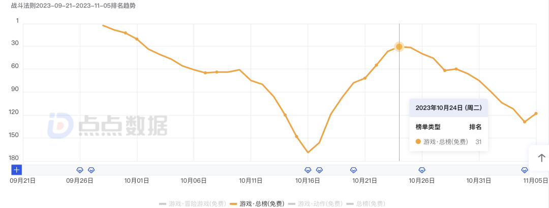 《战斗法则》的下载、收入曲线较为奇怪,上线后前半个月iOS免费榜成绩一路下跌,但后续呈现持续攀升状态;iOS畅销榜成绩则较为稳定。