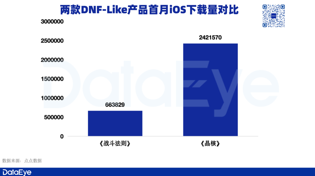 点点数据显示,《战斗法则》上线首日位列iOS免费榜第三。具体在下载量方面,《战斗法则》首月下载量约为66万次,对比而言,《晶核》有超200万次的下载(注:含上线前一天预下载)。