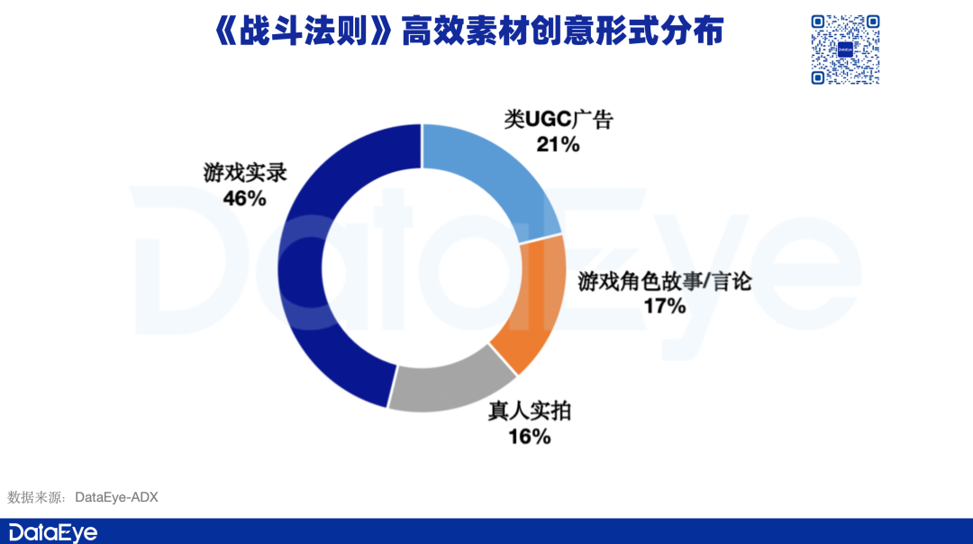 DataEye-ADX数据显示,今年以来,《战斗法则》最多计划使用的TOP50视频素材内容中,游戏实录素材占比最高达46%,其次是类UGC素材占比达21%。