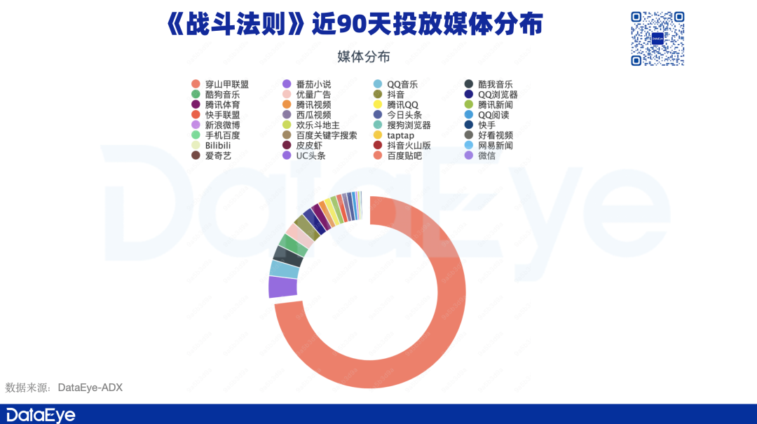 DataEye-ADX数据显示,近30天,《战斗法则》素材投放占比最高的平台是穿山甲联盟,在此之外,番茄小说、QQ音乐、酷我音乐等渠道也是《战斗法则》的投放重心。