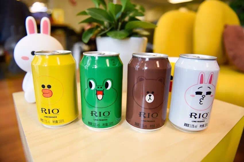 由一只熊、一只兔子还有一只小鸡等角色组成的“抢钱天团”LINE FRIENDS,时常会引爆中国社交网络。消费者乐此不疲地为这群小动物“捐资”。这次是预调鸡尾酒品牌RIO与LINE FRIENDS合作,推出4款不同形象的易拉罐包装。
