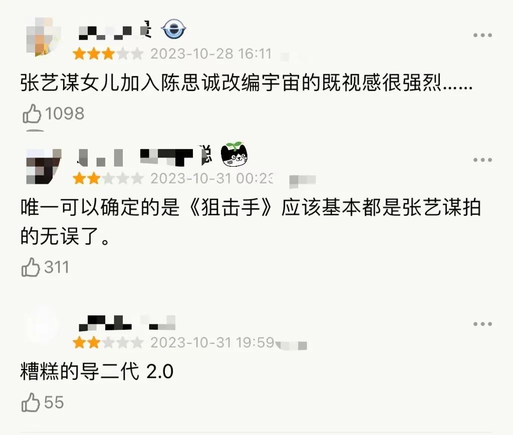 相较之下,电影的口碑则缺少亮点,目前,其豆瓣评分已经降至6.4。而在热门短评里,评判这部作品时,似乎都要带上一个特殊的标签:张艺谋女儿作品。