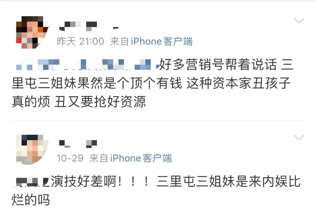 大众对于阶层固化带有抵触情绪,这也影响了他们看待娱乐圈的态度。大量星二代充斥在娱乐圈,流量时代烘托起的内娱资源咖泛滥,“三里屯三姐妹”、“范氏姐弟”等称呼中,暗含了大众对亲缘团体在内娱占尽优势的不满,“出身决定论”成为大众情绪敏感点。