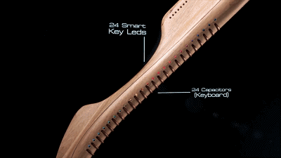每个键上都带有彩色的 LED 灯。实际上,这是一个灵敏的灯光系统,通过音调的表现,按键的颜色也会随之改变,这让演奏变得更直观,也更准确。