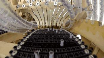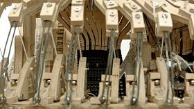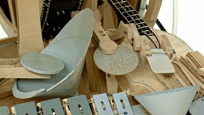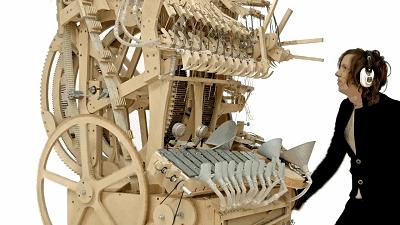它可以装得下 2000 多颗钢弹子球,这些弹子球会首先进入一个音乐漏斗,接下来这些弹子球会和机械按键有一个力的作用,就像过山车般,弹子球七上八下地落到乐器上,这个循环系统还可以让球回到最初的地方。