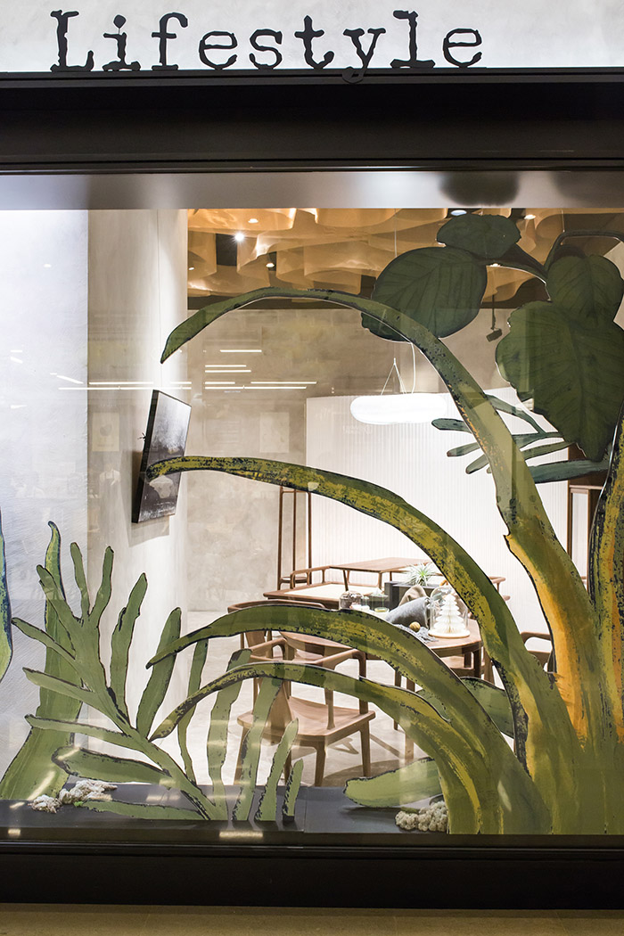 首家商场店让梵几也第一次拥有了橱窗。新店开幕第一期橱窗,梵几邀请人气插画师卤猫,以“家”为概念绘制具有节日气氛的橱窗装饰。