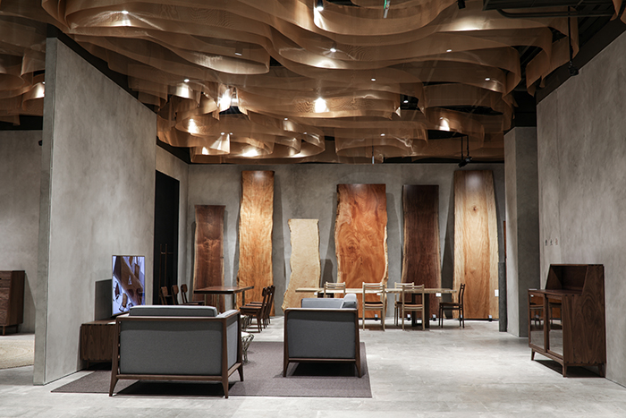 店内展示的梵几一枚板,选材来自日本、非洲、北美洲、东南亚等地平均树龄达到150年的木材。这些原木在日本由经验丰富的手工职人工加工完成,在经过一系列专业处理之后,形成成相纤薄但有着良好稳定性的桌面板。“一枚板”使用包括黑胡桃木、栃木、白杨、樱花木、红榉木、梧桐木等珍贵木材,也有意选用自然倒下或受损的树木代替砍伐古树。