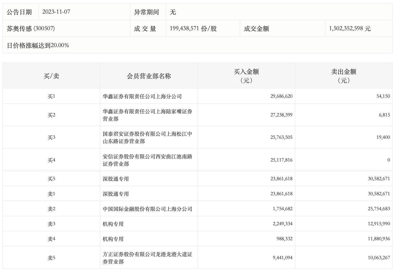 11月7日,苏奥传感今日涨停,全天换手率25.99%,成交额15.02亿元,振幅20.76%。龙虎榜数据显示,机构净卖出2155.93万元,深股通净卖出672.11万元,营业部席位合计净买入8310.38万元。深交所公开信息显示,当日该股因日收盘价涨幅达20.00%上榜,机构专用席位净卖出2155.93万元,深股通净卖出672.11万元。上榜的前五大买卖营业部合计成交2.37亿元,其中,买入成交额为1.46亿元,卖出成交额为9127.79万元,合计净买入5482.35万元。