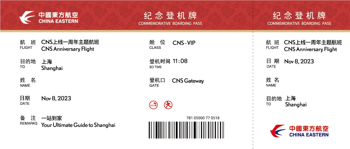 该主题活动为从伦敦飞往上海的特定航班的乘客提供独特的飞行体验。每位乘客将获得CNS定制的登机牌和创意纪念品,如护照夹和行李牌,同时机上服务员将引导乘客参与各项互动。乘客们可以通过特别设计的明信片,表达他们对CNS一周年的美好祝愿和未来期许,还可以参与手持含有CNS和上海元素的标牌在万里高空留下影像纪念。