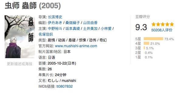 在黑屋君的二次元一生推的名单里,第一名是《海贼王》,第二名是《虫师》,第三名是上次推荐过的《夏目友人帐》。之前黑屋君写过一篇关于《夏目友人帐》的文章推荐给大家看,好多人跑来问我,二次元一生推的名单里第二名《虫师》是什么?