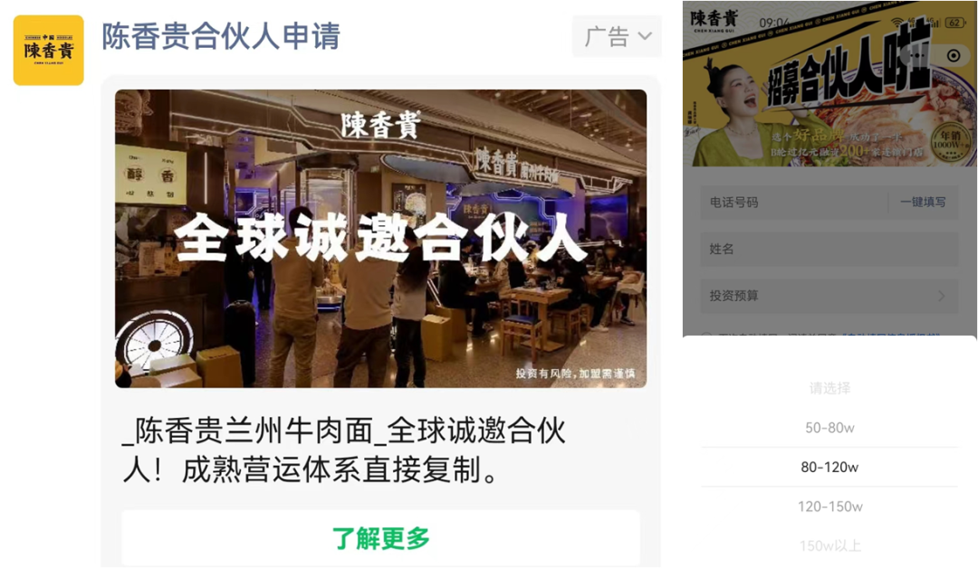 没有更多资本扶持,陈香贵转而在微信朋友圈发布广告来“化缘”。近日,据新零售商业评论看到的广告信息显示,陈香贵“全球诚邀合伙人”,宣称“成熟营运体系直接复制”,合伙的投资预算最低一档是50万~80万,最高一档是150万以上。