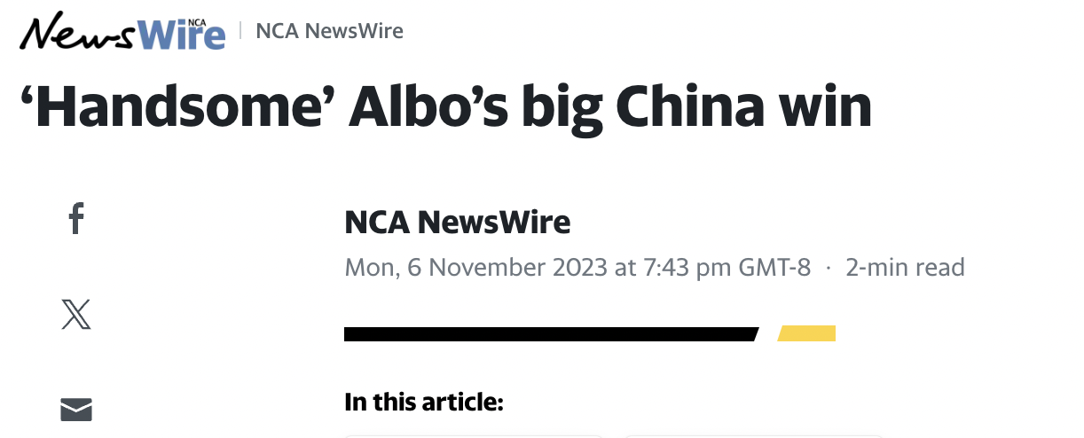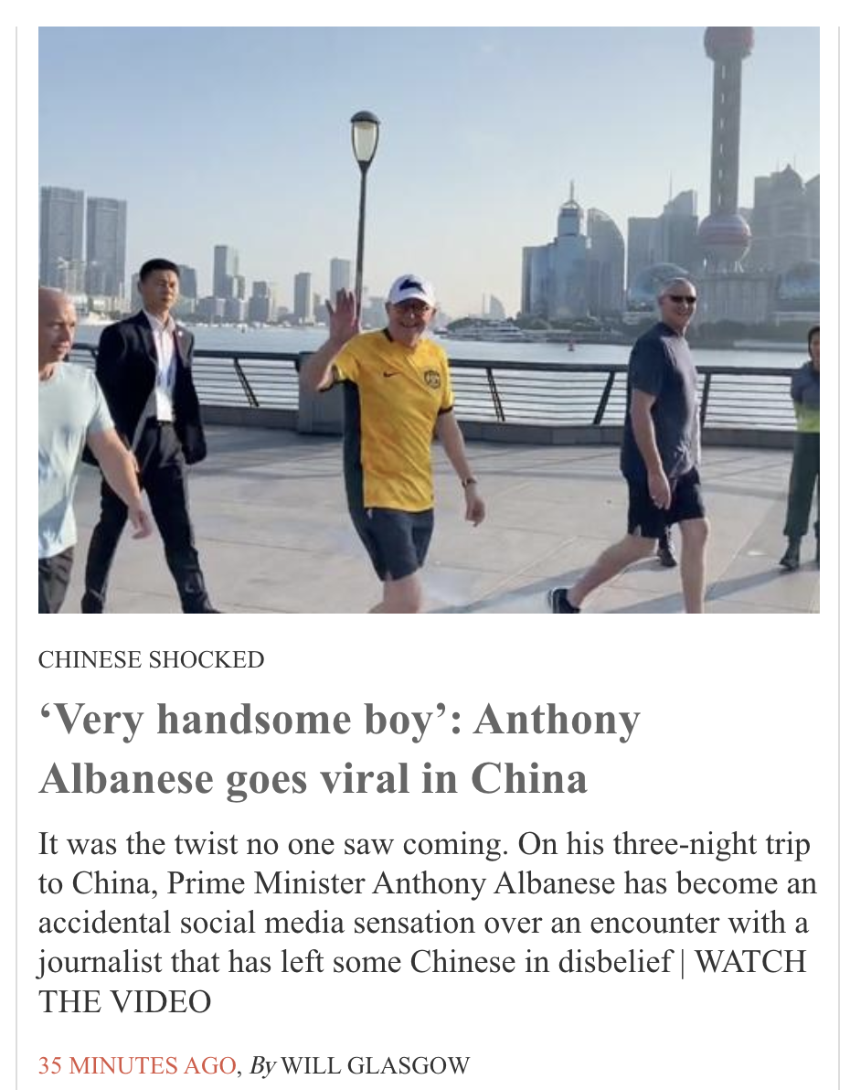 这个说法来自周二阿尔巴尼斯与中国国务院总理李强的会面。澳媒报道称,李强提到中国社交媒体对阿尔巴尼斯的热议,包括他在中国国际进口博览会的演讲,以及在上海外滩晨跑、并与路人互动,“人们都说这有一个澳大利亚帅哥”。