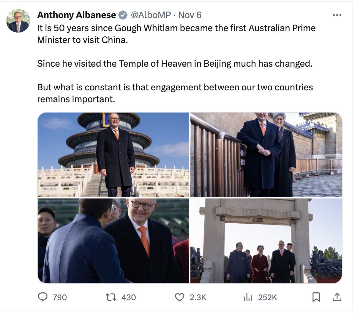 阿尔巴尼斯在社交媒体X上晒出多张打卡天坛的照片,并写道:“距离惠特拉姆成为首位访华的澳大利亚总理已经50年了。自他参观天坛以来,情况发生了很大变化。但不变的是,我们两国之间的接触仍然很重要。”