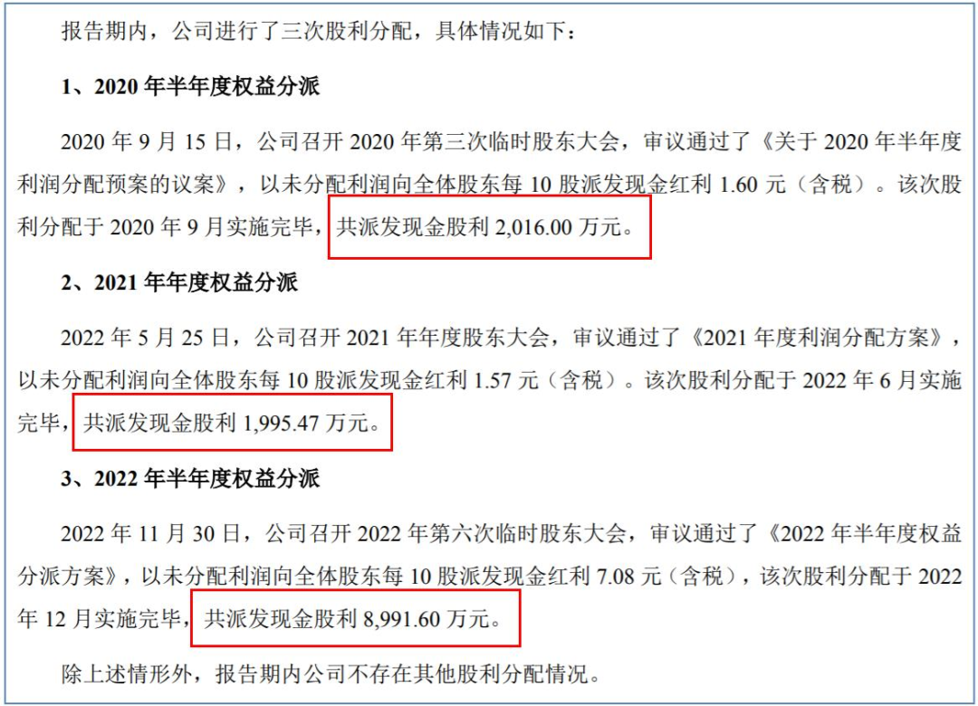 招股书显示,2020年-2022年,公司进行了三次现金分红,分别派发现金红利2016万元、1995.47万元和8991.60万元,合计约1.3亿元。