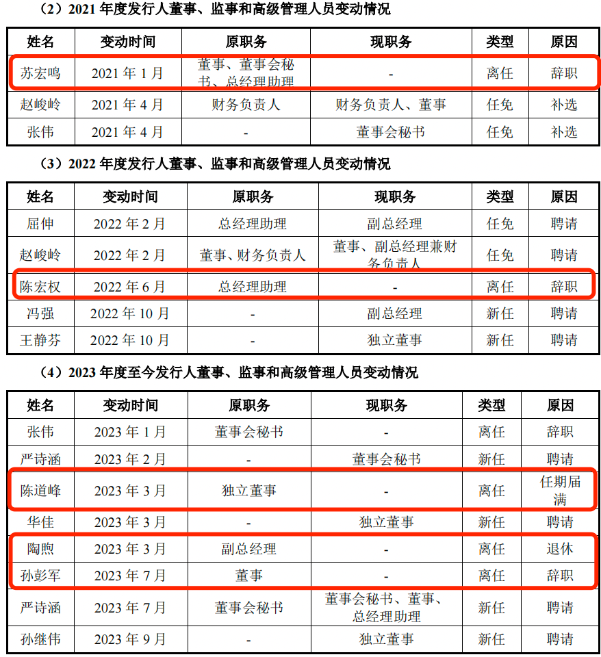 不仅如此,2022年6月,公司总经理助理陈宏权辞职;2023年3月,独立董事陈道峰因任职届满6年离职,副总经理陶煦因退休离任;2023年7月,董事孙彭军因个人原因离任。