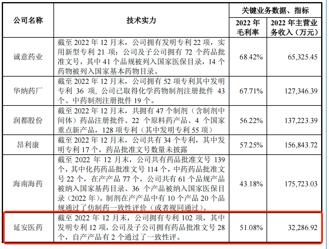 与此同时,截至2022年12月末,延安医药仅有12项发明专利。但是同行可比公司诚意药业、华纳药厂、润都股份、昂利康的发明专利分别为22项、36项、55项、17项。延安医药发明专利数量远落后于同行可比公司。