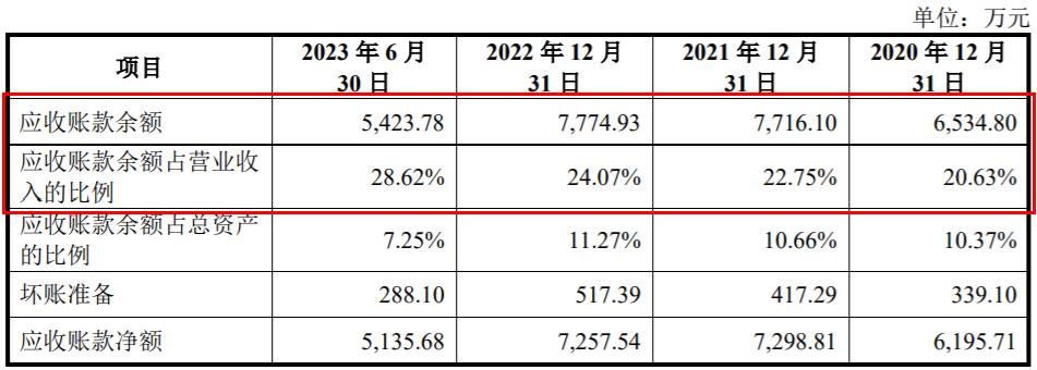 报告期各期末,公司的应收账款余额分别为6534.80万元、7716.10万元、7774.93万元和5423.78万元,占营业收入的比例分别高达20.63%、22.75%、24.07%和28.62%,占比不断增长。