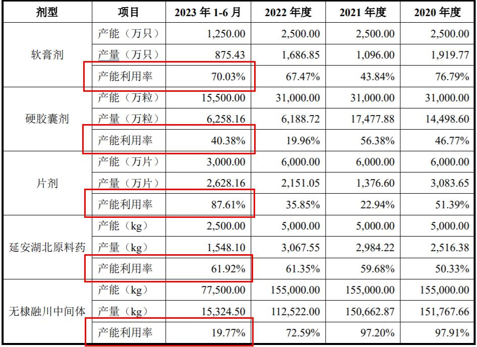 「子弹财经」注意到,专利和药品批准文号不及同行之时,延安医药的产能利用率也不饱和。